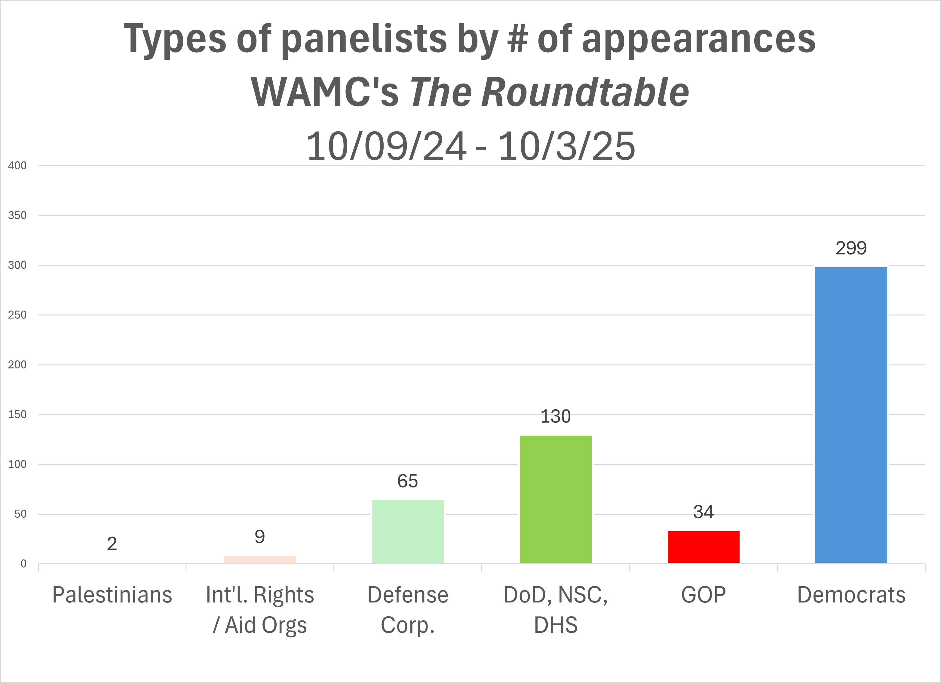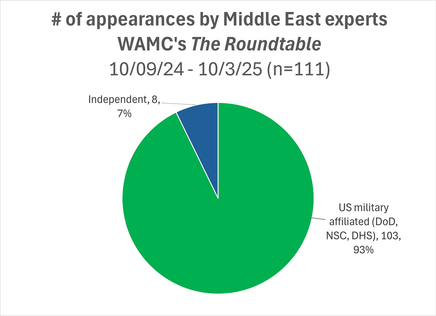 Presenting new data covering the second year of the Gaza war (10/9/24-10/3/25), this post documents The Roundtable’s near total dependence on Middle East experts affiliated with US and Israeli military agencies and defense corporations. The data further shows The Roundtable also overwhelmingly turned to Democratic party insiders over panelists from humanitarian aid or human rights groups. I will show that this pattern of source selection constitutes media bias towards institutions that organize political support, revenue, and weapons flows for Israel’s genocide. These sourcing practices by Roundtable producers clearly violate WAMC’s own stated ‘Code of Ethics,’ as I explain. The post ends with action steps we can take today and during WAMC’s fund drive starting next week!