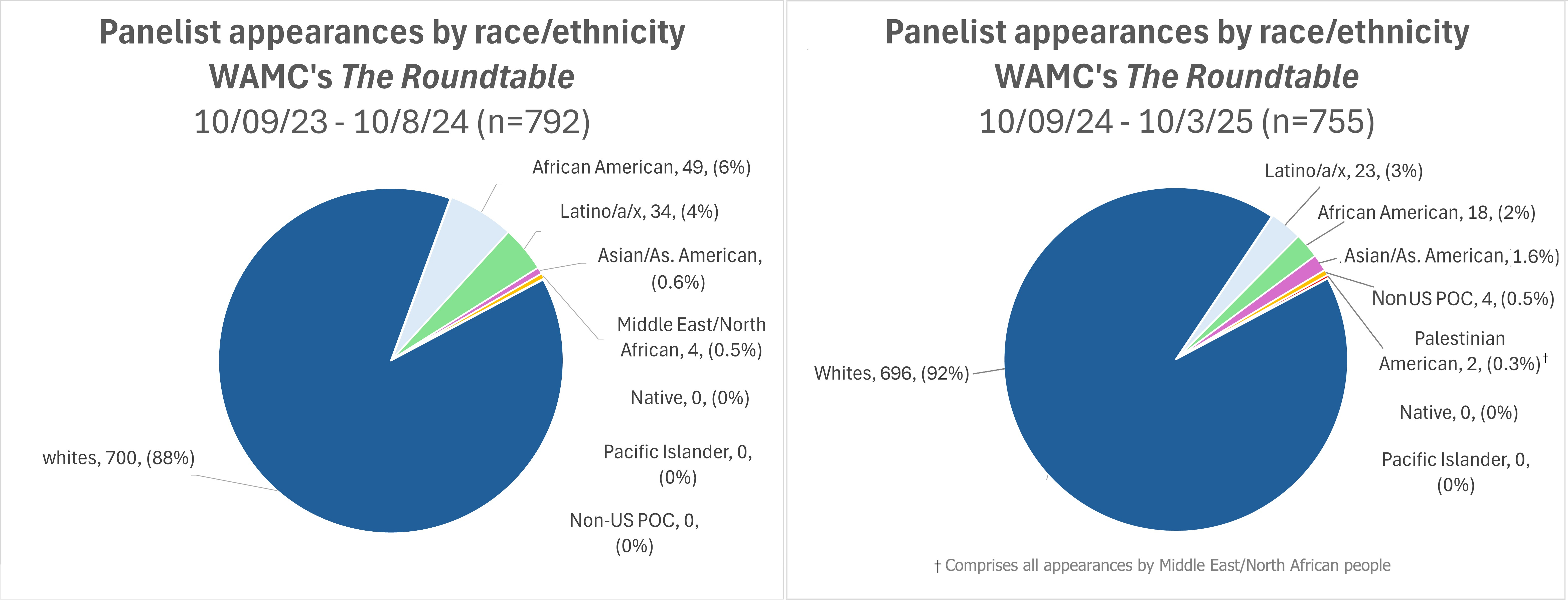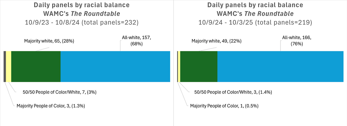 WAMC, the seven-state New England NPR affiliate, makes big promises about their dedication to inclusion and to listening to the needs of audiences. WAMC management reported to the federal government (Guidestar, 2025), that listening to audiences helps “To identify where we are less inclusive or equitable across demographic groups.” I offer this post as an example of listener feedback that explicitly identifies The Roundtable as one place where WAMC is “less inclusive or equitable across demographic groups.” The data presented below covers two full years of Roundtable episodes and documents a clear pattern of white dominance that worsened to extreme levels over the last 12 months. The growing racial imbalance I document spans nearly the entire period of Israel’s war on Gaza and the first year of the Trump regime’s implementation of police power to racially profile and terrorize millions. As such, the data evidences a failure to present the precise kind of “inclusive” and “equitable” news coverage as claimed in WAMC’s branding efforts.