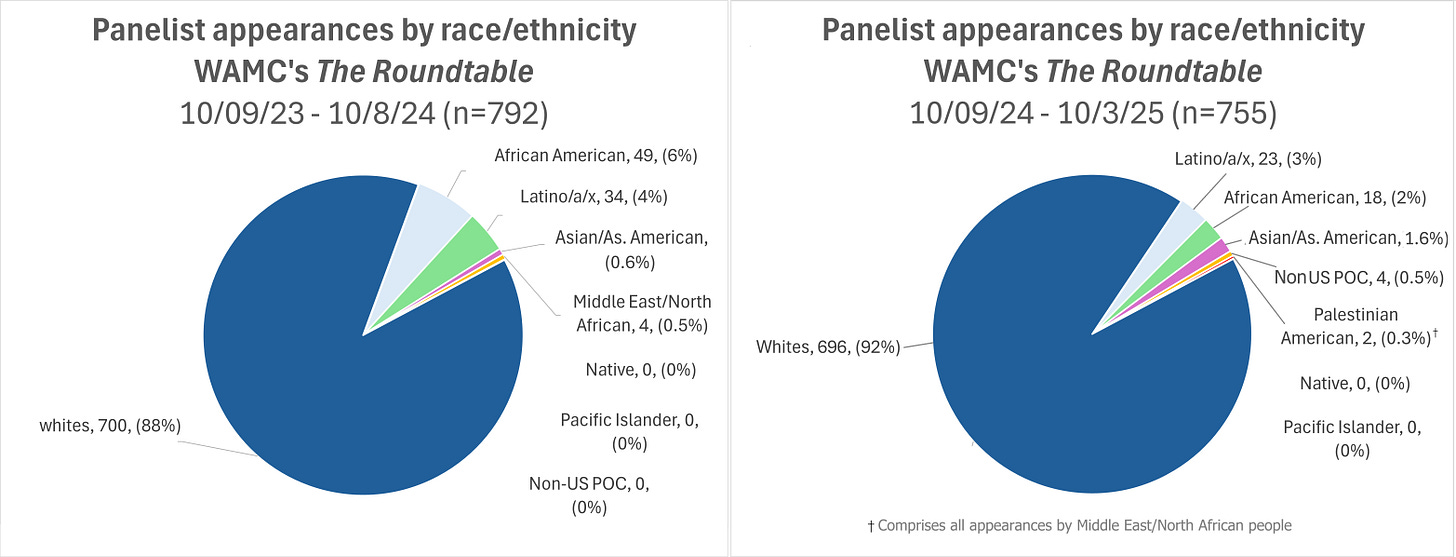 Will station managers fulfill their promises to listen and redress the growing problem of racism on The Roundtable? Without significant listener pressure that seems unlikely. After all, WAMC managers and producers knew about this problem for a long time. Recent campaigns generated almost 1,000 emails to station managers demanding increased Palestinian representation on the show. Audience members called for increased racial diversity at two live Roundtable events (9/19/24,1 7/8/252). Listeners also posted complaints on the station’s social media accounts — only to find that discussion erased. I contacted WAMC multiple times about findings about my prior data on racial exclusions on the program. I also presented my findings to WAMC’s Board of Trustees in June 2025. Despite the fact that station managers and program producers knew there was a racial inclusion problem on The Roundtable, the problem grew more extreme over the past year, as the data released in this post shows.