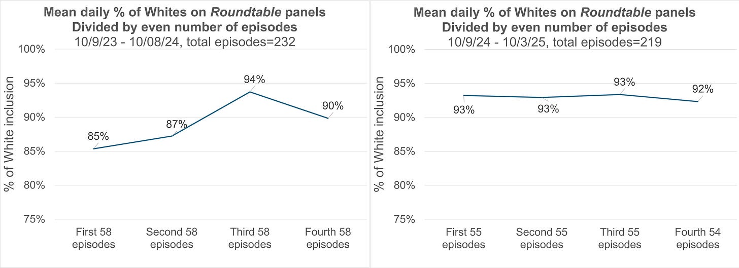 White domination of daily Roundtable panels increased to new extreme levels during 2024-25