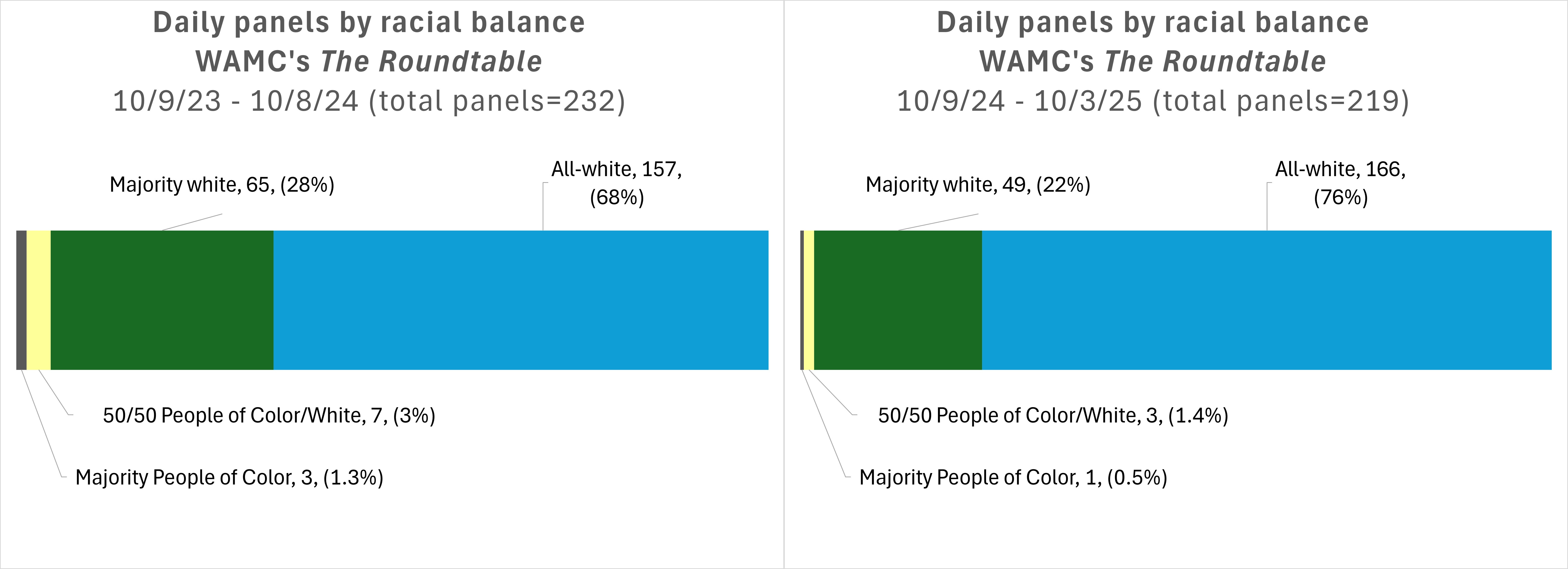 Daily racial diversity on daily Roundtable panels declined over the past year. Whites averaged between 85% and 94% of panelists on daily episodes between 10/9/23 and 10/8/24, as I previously documented. The new data shows White proportions of daily panels grew to a steady 92-93% from 10/9/24 to 10/3/25, marking losses in racial diversity in 3 quarters. This 7-8% representation of BIPOC people on Roundtable panels is one-third the 25% proportion People of Color occupy in WAMC’s broadcast region.